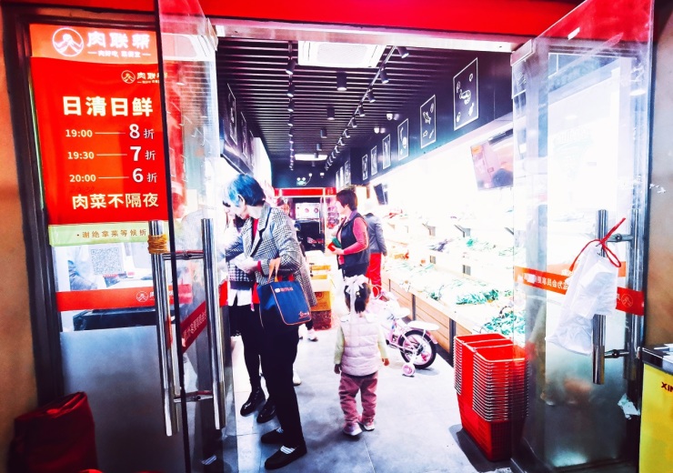 生鲜超市的货架上,当季新鲜的果蔬肉菜已经整齐摆放,一群“赶新鲜”的居民正在埋头挑选商品。