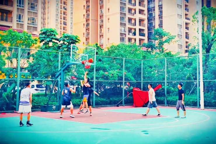 球场上,刚刚结束了一天辛苦工作的年轻人换上了一身运动装束,叫上三五邻居,来了一场热血篮球赛。