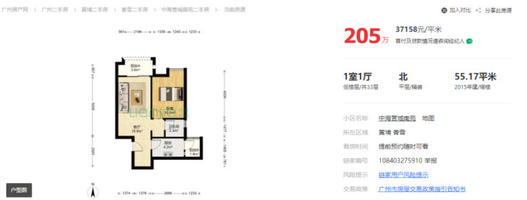 大林曾将目光投到了大热的黄埔区,如中海誉城二手房,建面约55㎡一房一厅。