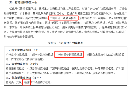 广州十四五规划截图规划指出,依托重大交通枢纽和重大产业园区,广州将构建“5+10+N”物流枢纽布局,打造全球效率较高、成本较低、较具竞争力的国际物流中心。 其中,广州东部公铁联运枢纽是5个特大型物流枢纽之一。 广州东部公铁联运枢纽处于大湾区货运铁路U形顶点,向西、北通过京广铁路辐射西北内陆,打通川贵广—南亚国际物流大通道,向东、北通过京九铁路打通粤、苏、皖、赣四省物流大通道,具备交通—物流—产业融合发展的优质条件,是能实现“通道+枢纽+产业”充分融合发展的粤港澳大湾区珠江东岸少有的多式联运生产服务型高级物流枢纽。该枢纽10公里范围内有6条高速公路环绕,30分钟到达广州中心城区和东莞、惠州市区及深圳宝安机场,40分钟到达南沙国际海港,多式联运优势明显。