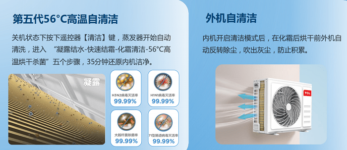 随着越来越多家庭选择风管机替代家用挂机,风管机的出风洁净度、机身清洁便捷度都成为消费者购买风管机的考虑因素。TCL怡静风风管机具备第五代56°C高温自清洁功能,在关机状态下按下遥控器【清洁】键,蒸发器开始自动清洗,进入“凝露结水-快速结霜-化霜清洁-56℃高温烘干杀菌”五个步骤,35分钟还原内机洁净,对H3N2病毒、H1N1病毒、71型肠道病毒灭活率达99.99%,大肠杆菌除菌率达99.99%。内机开启清洁模式后,在化霜烘干前外机自动反转除尘,防止灰尘积累。使用TCL怡静风风管机,有利于呼吸健康,也为用户省去了人工清洗空调的麻烦和成本。
