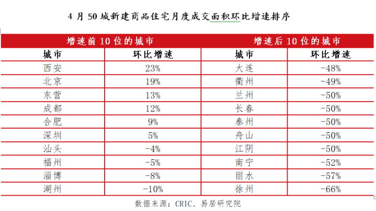 上海易居研究院最新发布的《4月50城新房成交报告》则显示,今年1-4月份全国50城新建商品住宅成交面积为7715万平方米,同比增速为18%,相比1-3月份15%的水平有所扩大。其中,4月,全国50个重点城市新建商品住宅成交面积为1896万平方米,环比下降27%,同比增长30%,有44个城市呈现了环比下降态势,占比近9成。
