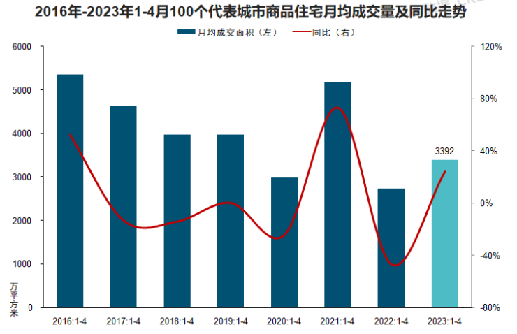 据中指院数据统计显示,4月重点城市房地产市场规模在3月冲高后出现回落,新房成交面积环比下降约两成,在上年同期低基数下同比仍增长超四成。2023年1-4月,重点100城商品住宅月均销售面积同比增长超20%,但绝对规模仍处2016年以来同期低位。