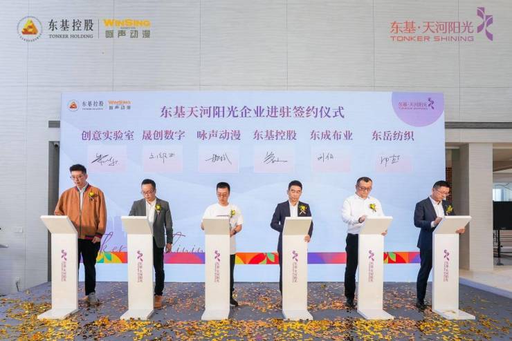 东基控股关董、咏声动漫古董、东岳纺织郭总、东成布业刘总、晟创科技刘总、创意实验室黄总等企业领导齐聚一堂,握手签约,共商天河芯未来。