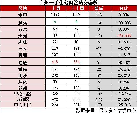 具体来看,外围五郊区依然是成交主力,上周共计成交972套,中心六区则成交390套。其中增城以418套成交居首,而成交套数最少的越秀则只成交了6套。