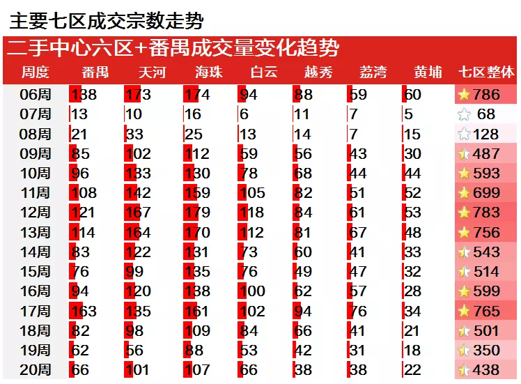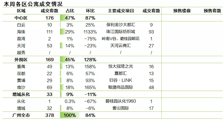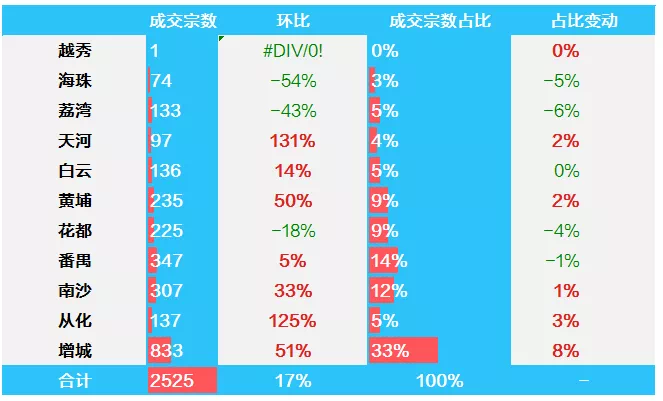 在主要七区中,大部分区域成交量均有所上涨。其中,天河、白云、荔湾三区跌幅相对明显,本周分别成交101宗、66宗、38宗,环比分别上涨80.4%、24.5%、22.6%。天河成交占比更是上涨至23.06%,环比净增7.06%。另外,本周越秀区成交不升反降,共成交38宗,环比净减9.5%。