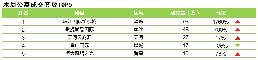 本周广州公寓市场仍然零供应,成交则环比上涨84%,达378套。除节后复苏外,本周公寓市场的成交增长主要来自海珠区个别项目的批量成交。其中海珠区成交突破110套,占全市公寓成交量的3成左右。区域旧盘珠江国际纺织城本周批量成交了三层现楼公寓,共计93套,目前售价约3.2万元/㎡。本周外围区公寓成交热度回升,四个主力区的公寓成交均有明显增长。成交相当活跃的有敏捷尚品国际、恒大冠珺之光、归谷·LINK,分别跑量48套、16套、15套。此外,天河云商汇、增城区誉山国际等热点项目也有两位数的公寓成交。