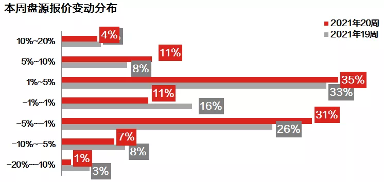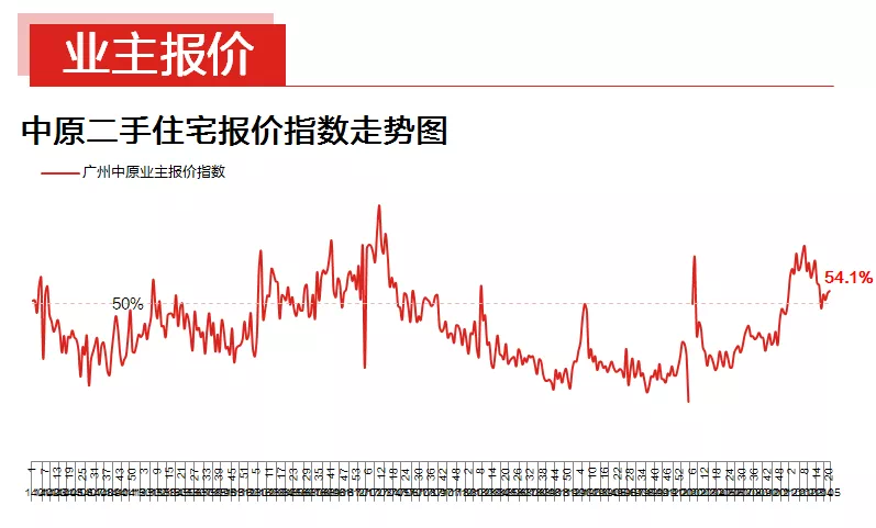 本周业主报价指数为54.1%,环比上涨0.7%。目前由于市面上房源紧缺影响,供不应求状况未能有效改善,促使部分购房时间过5年的业主甚至出现上调报价的情况,业主报价信心增强。整体看,本周报价下调1%-5%之间的盘源占31.2%,较上周上涨4.9%。而报价上调1%-5%以内的盘源占比则较上周增加1.5个百分点,共占34.5%。另外,本周报价上调5%-10%的盘源环比净增3.1个百分点,共占11.3%。