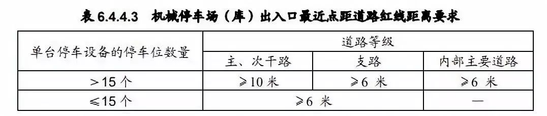 6.4.4.3 机械式停车场(库)出入口的排队长度,不应影响到道路车辆正常通行。出入口最近点 距道路红线,应符合表 6.4.4.3 规定。