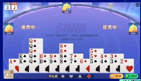 比赛正式打响。屏幕前,选手们迅速进入状态,每次出牌都经过深思熟虑。线上赛考验双人的默契配合,选手们时而利用“对子”、“顺子”等组合牌型压制对手;时而巧妙布局,通过“炸弹”等强力牌型逆转局势。在这场没有硝烟的战争中,每个细节都至关重要,每次决策都可能影响最终的胜负。