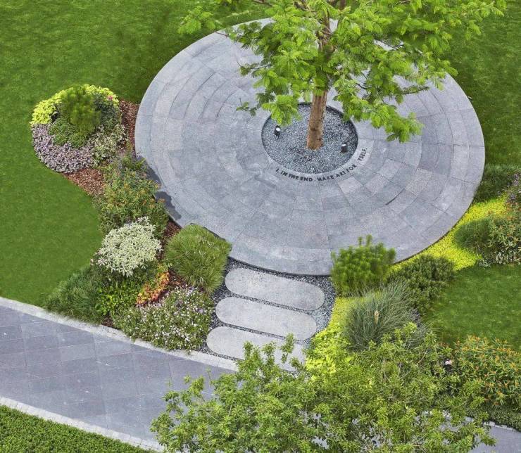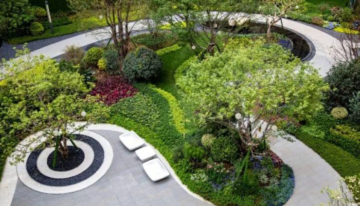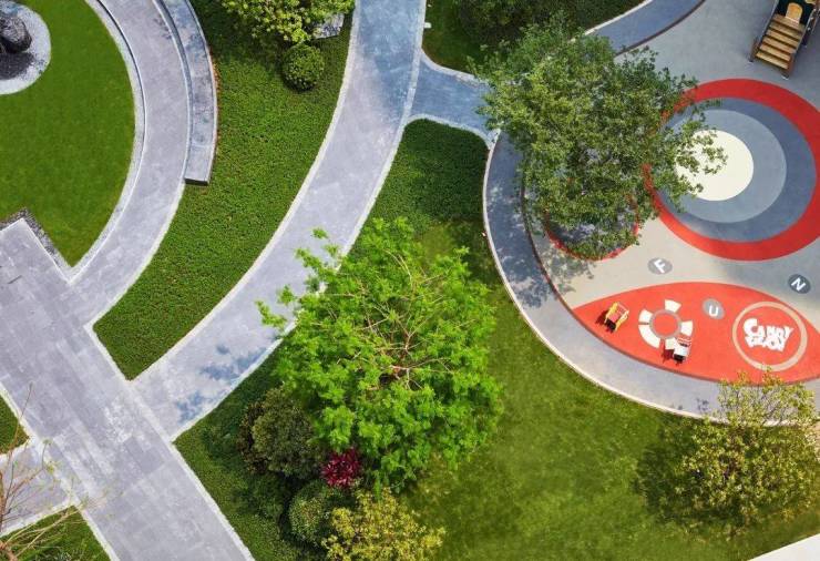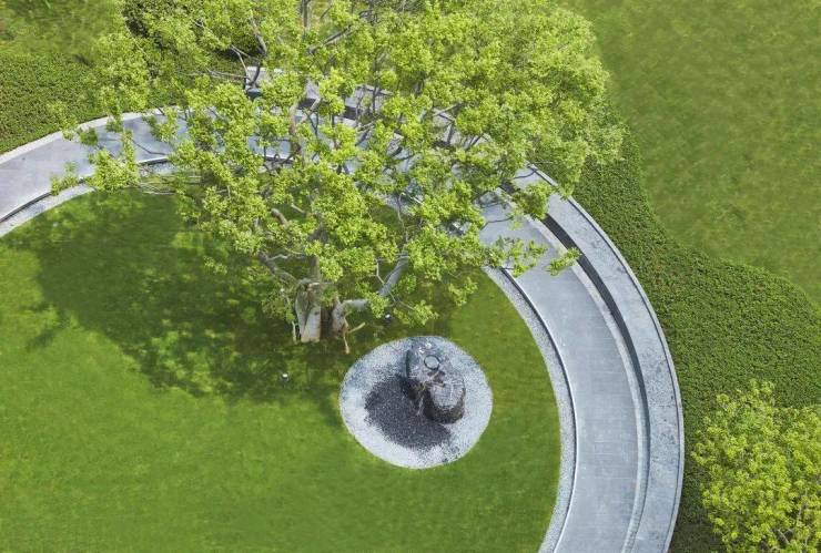 像是为业主打造的林下会客区,打造成了开放式的圆形草坪,业主无论从哪个方向都可进入会客区 散步、运动,还能办一场“邻里音乐会”。