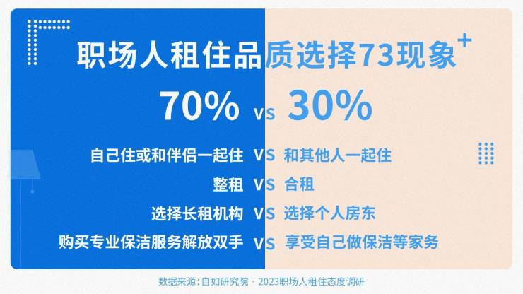 在品质要求方面,时下职场人呈现出“租住品质选择7、3现象”。数据显示,相比于与他人合租、自己动手解决水电维修等问题、自己做定期保洁、找个人房东房源,70%的职场人会更愿意自己住或者与情侣同住、请租房平台管家解决问题、购买专业保洁等生活服务、选择机构的房源。