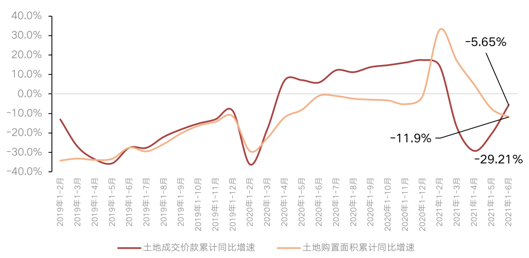 图:全国房地产开发企业土地购置面积和土地成交价款增速