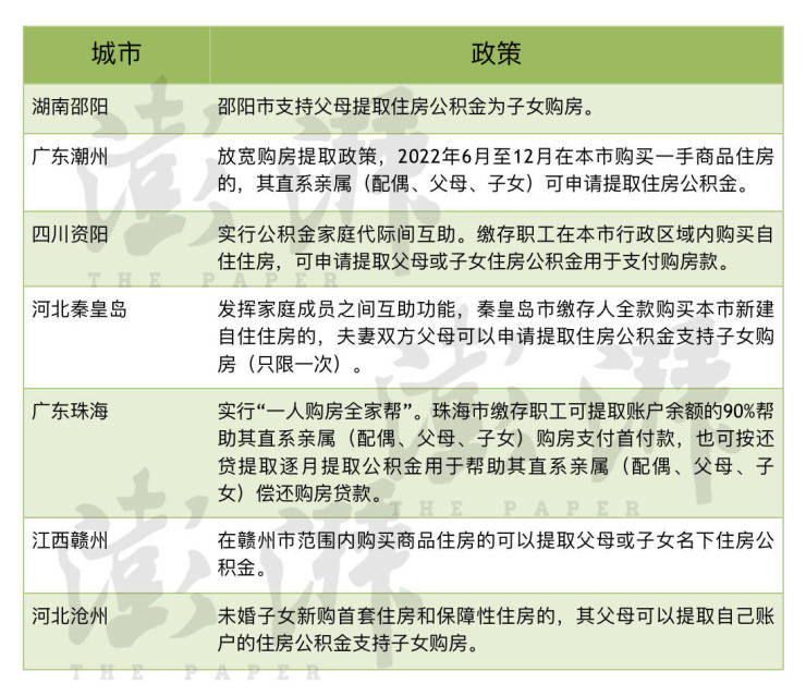 据澎湃新闻不完全统计,仅5月以来,至少包括湖南邵阳、广东潮州、四川资阳、河北秦皇岛、广东珠海、江西赣州、河北沧州、安徽池州、云南楚雄等9城发布公积金贷款新政,多地在政策中提到,实行公积金家庭代际间互助,实行“一人购房全家帮”。以广东珠海为例,6月1日,珠海市住房公积金管理中心发布《发挥住房公积金作用支持服务“产业排名前列”工作方案》,《方案》中提及,实行“一人购房全家帮”。珠海市缴存职工可提取账户余额的90%帮助其直系亲属(配偶、父母、子女)购房支付首付款,也可按还贷提取逐月提取公积金用于帮助其直系亲属(配偶、父母、子女)偿还购房贷款。