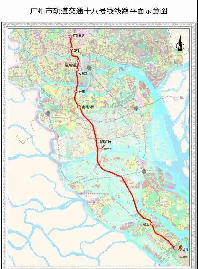 18号线起于南沙区万顷沙枢纽,经明珠湾区、番禺广场、琶洲、珠江新城,止于广州东站枢纽。