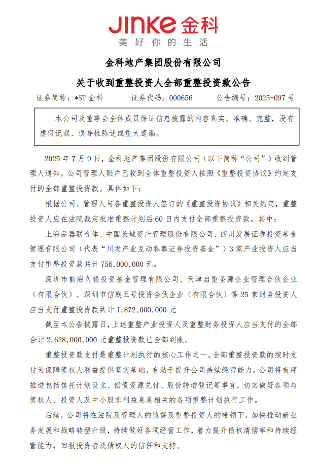 7月10日,金科股份发布关于收到重整投资人全部重整投资款公告。公告指出,7月9日,公司收到管理人通知,公司管理人账户已收到全体重整投资人按照《重整投资协议》约定支付的全部重整投资款。