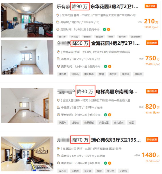 在诸葛找房平台显示,11月22日查询,广州24小时内的降价房源就高达1252套!降价10万以内的属于是常规操作,降大几十万的也比比皆是。