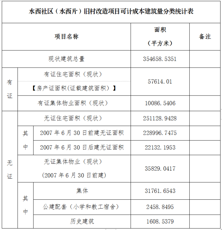 公开数据显示,长岭街道水西社区(水西片)第一至第六经济合作社旧村范围内实测总建筑面积35.46万平方米,其中村民住宅30.87万平方米,集体物业4.2万平方米,公建配套2459平方米,历史文保1608.5平方米。改造范围的总用地面积约为46.96万平方米(建新范围面积约为33.87万平方米),其中居住用地16.10万平方米,公共管理与公共服务用地4.82万平方米,商业服务业设施用地5.45万平方米,道路与交通设施用地4.69万平方米,绿地与广场用地1.74万平方米。