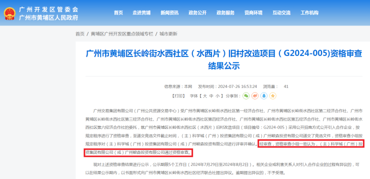 今年6月7日,广州公共资源交易中心发布广州市黄埔区长岭街水西社区(水西片)旧村合作改造类项目公开引入合作企业公告,公开招商合作改造企业。在近日发布的公告显示,(主)科学城(广州)投资集团有限公司(成)广州峻森投资有限公司通过资格审查。