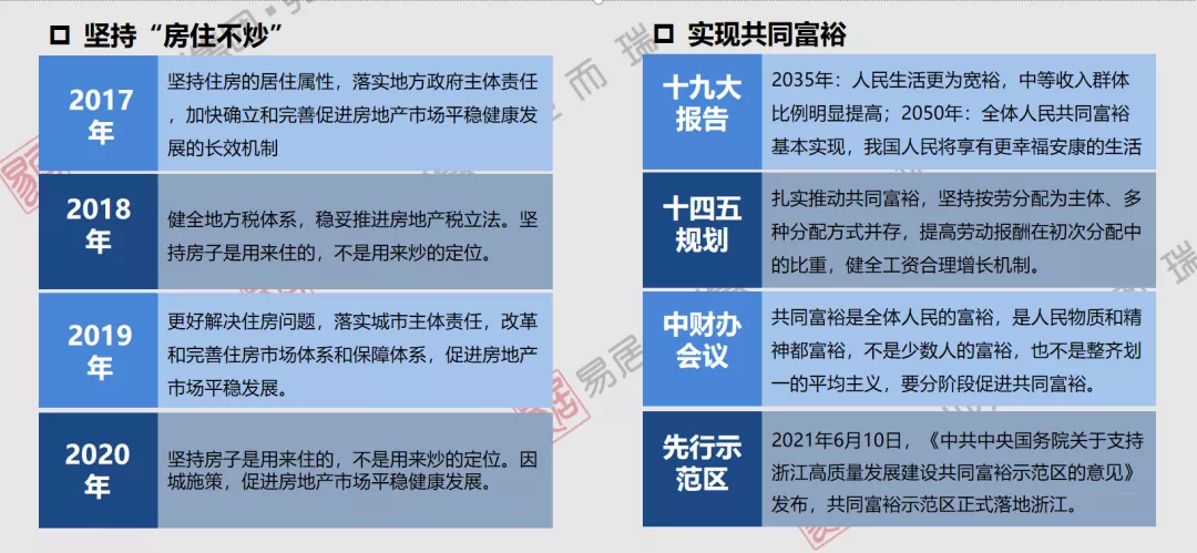 “房住不炒”的政策环境以及共同富裕的发展目标,是推动房地产税试点以及立法的重要背景;房产作为居民重要财富之一,通过扩大税收,可调节收入与财富分配,缩小贫富差距,促进共同富裕目标的实现。