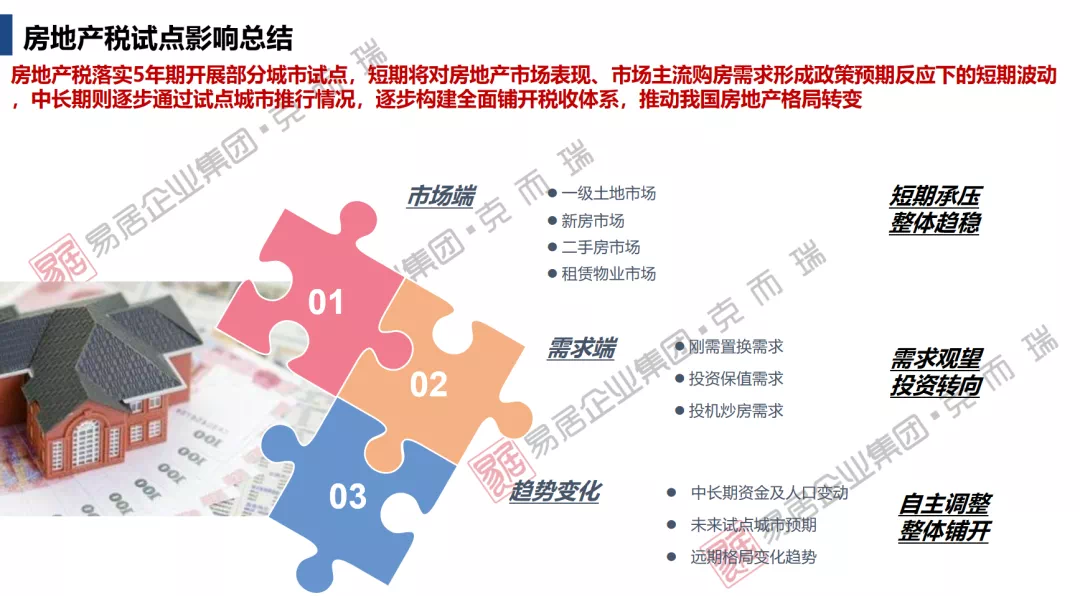 对市场端、需求端以及整体趋势变化三大范围的影响预判!自住型(刚需及刚改):随着试点政策落地,预期试点城市免征力度大,刚需刚改购房需求逐步得到释放,试点城市内自住需求成交占比逐步增加;投资保值型:需求继续存在,核心城市优质物业保值属性仍高于其他投资产品,房地产投资仍能吸纳部分自己实力较强的投资需求;投机炒房型:需求占比将受挤压,预判到在房地产税试点期间,拥有多套房产的投机型客户将逐步抛售三四线城市低价值资产,以免造成房地产税立法落执行地后集中抛售无法脱手的情形。