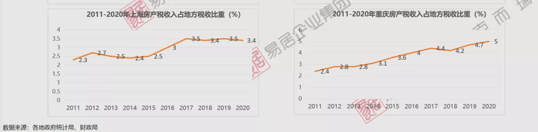 克而瑞数据统计到,试点十年以来,两市房产税收保持稳定上升趋势,但占地方税收比重仍不到5%,由于两市税率低、税基小、免税力度大,两市房产税对城市税收收入贡献甚微。