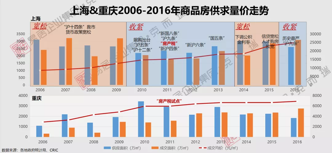 其中,由于2010年后上海连续四年密集出台限购限贷等政策,导致成交量快速回落,而重庆市场政策宽松,试点政策出台后,成交量仍保持上升趋势;总结来看,由于两市房产税免税额较高,税率较低,使得其市场影响远不及限购限贷等调控政策。