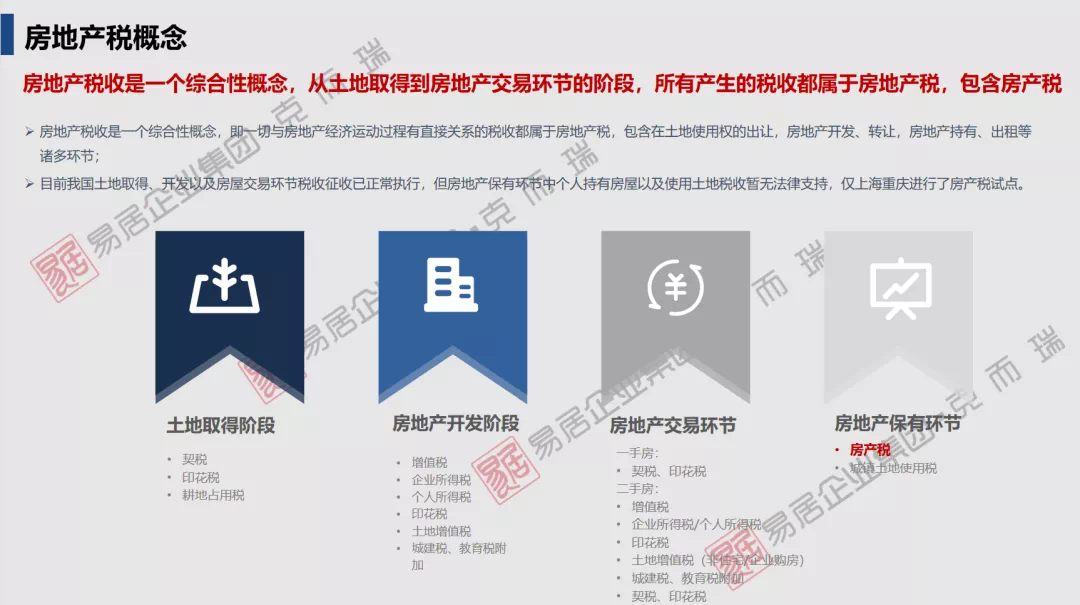 概念梳理下,房地产税收是一个综合性概念,从土地取得到房地产交易环节的阶段,所有产生的税收都属于房地产税,包含房产税。备注:目前我国土地取得、开发以及房屋交易环节税收征收已正常执行,但房地产保有环节中个人持有房屋以及使用土地税收暂无法律支持,仅上海重庆进行了房产税试点。