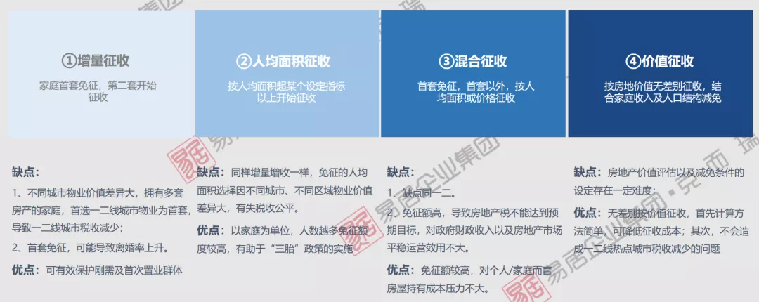 研究认为,结合过去上海重庆房产税试点征收方法以及其他国家主流的征收方式,目前试点阶段可能采取混合征收方式,通过先易后难、循序渐进的方式,先单城市试点后全面铺开;未来房地产税立法后,按价值无差别征收,并结合家庭收入及人口结构进行相应减免,或更符合中国国情。