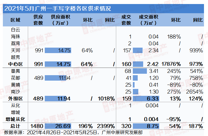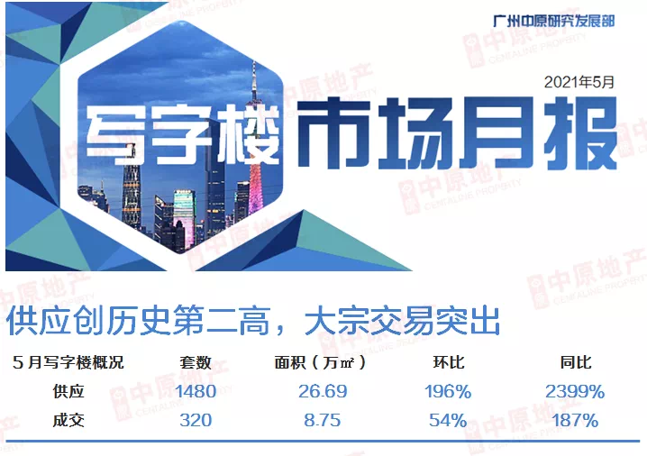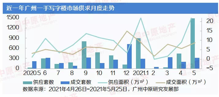5月广州写字楼市场集中入市1480套26.69万㎡,供应量仅次于2018年12月的28.32万㎡,为历史第二高位。