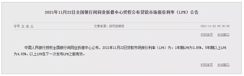 今日(11月22日),央行公布了较新一期的贷款市场报价利率(LPR)。