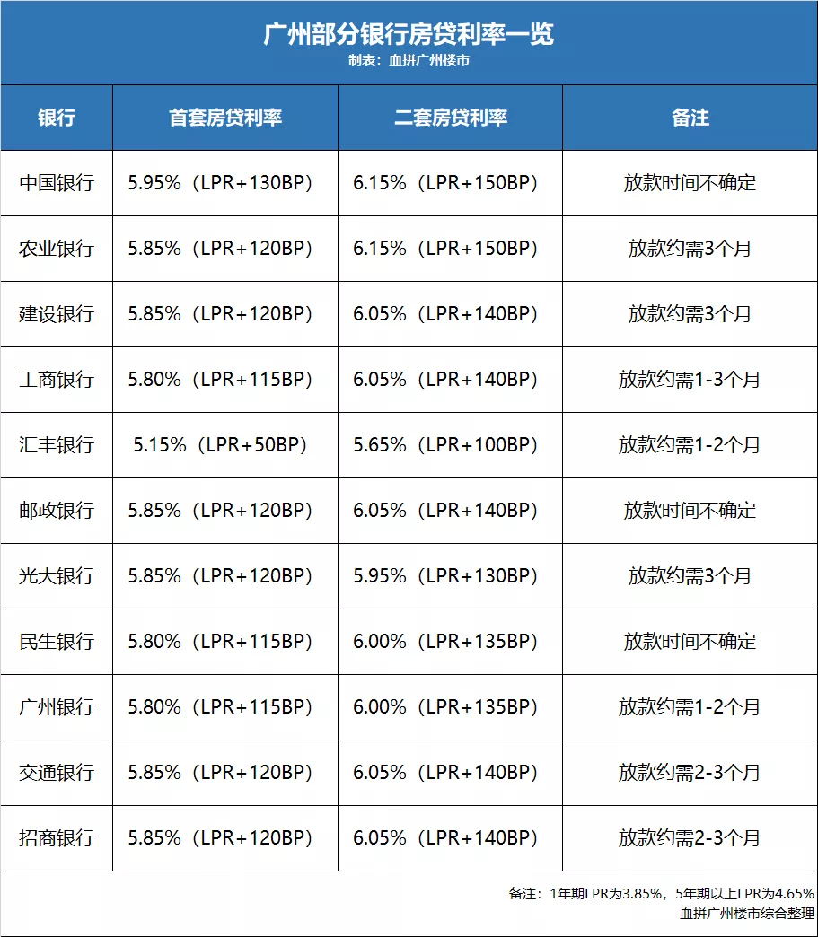 LPR不动,房贷利率也难有大改。纵观目前广州各大主流银行,首套房贷利率主要为5.85%(LPR+130BP),二套房贷利率为6.05%(LPR+140BP)。