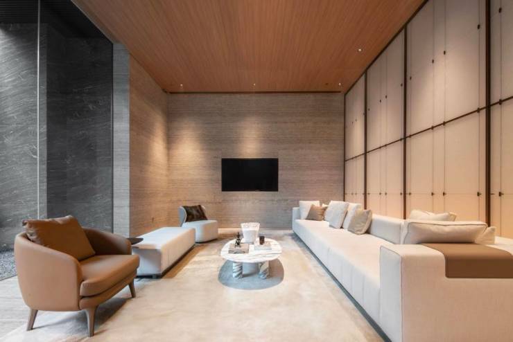 室内由亚洲室内设计巨匠唐忠汉亲自操刀,打造源于东方美学的现代隐奢风格。整体硬装引入世界主流的中性色系——大地色系。材料选用暖白灰色系的岩板、石材等,旨在回归质感的去风格化空间,使不同高端客户的个性化搭配的可塑性尽可能放大。