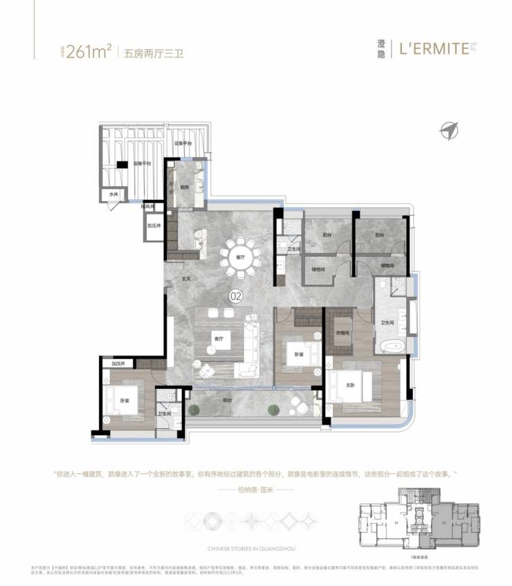 琶洲·樾目前在售建面约225㎡、249㎡、261㎡大平层。其中看到的建面约261㎡实体户型,设置5室2厅3卫,全明设计,南北对流,南向采光面约20m,其中阳台面宽就接近9m。全屋共设2个套间,可供不同家庭成员充分灵活利用。LDK无界大方厅、中西厨设计,将新派豪宅的尺度感发挥得淋漓尽致。
