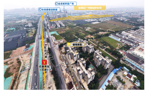 广州新城停车场场站综合体(一期)地块地处地铁3号线东延线(在建)、17号线(规划)沿线,距离地铁石碁南站(在建)约800米,驾车可快速到达广州南站、琶洲商务区、广州国际创新城等重要功能片区。
