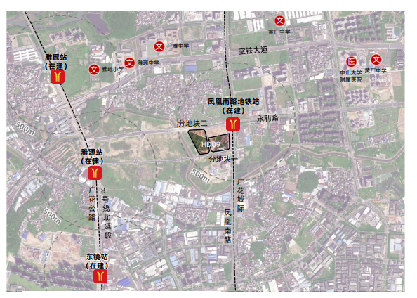 其中,广花公路东一(A3)地块紧邻凤凰南路地铁站(在建广花城际线),临近凤凰南路、永利路(在建)、空铁大道,驾车15分钟可达白云机场、广州北站。周边教育、医疗资源丰富,有广雅中学(花都校区)、黄广中学、雅瑶中学、中大附属医院等。