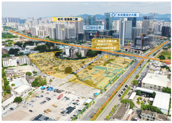 AB2603123、AB2603087地块处于广州设计之都核心片区,周边现有地铁2号线黄边站1处站点、地铁14号线鹤南、彭边、创意园4处站点,且生活配套相对齐全,时光汇和YH城两大超5万㎡的商场、白云区人民医院,黄边小学以及云英实验学校等可近距离满足商业、医疗、教育需求。