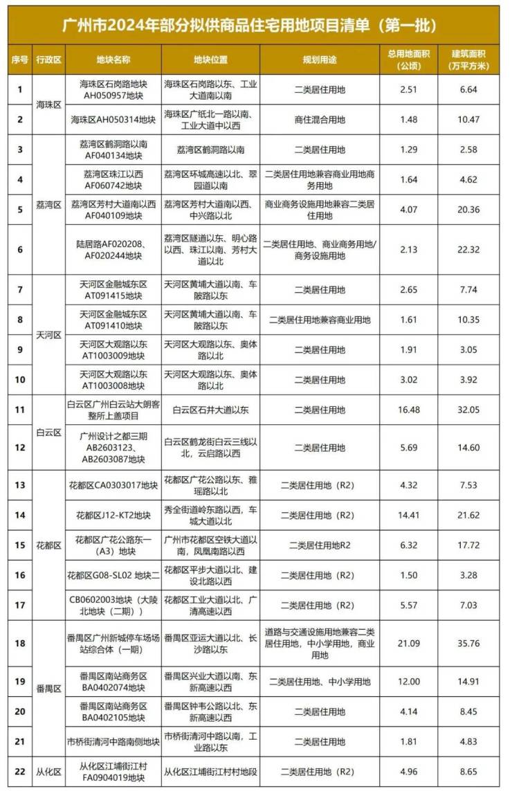 日前,广州市2024年部分拟供商品住宅用地项目清单(第一批)公布,提及22宗涉宅地,引人关注。