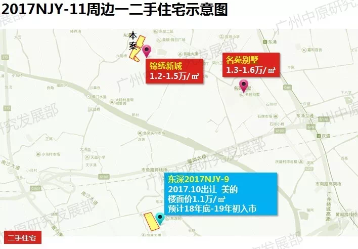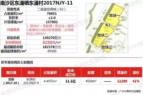 东涌板块于2017年10月曾出让东深村2017NJY-9地块,该地块占地4.49万㎡,最终以总价11.1亿+450㎡配建面积由美的夺得,折合楼面价11280元/㎡。