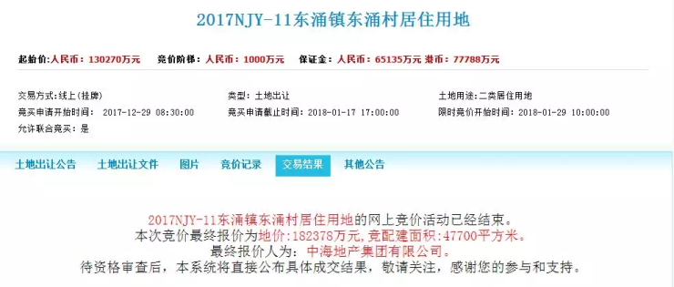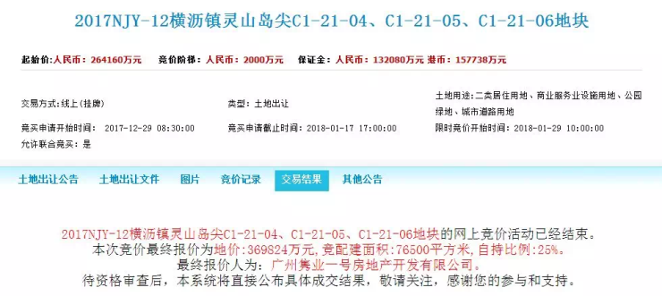 本次出让的2017NJY-12地块是灵山岛尖首次公开出让的居住地块,此前出让的3个地块均为商服用地,分别由广东交通、越秀以及中金国际贸易拍得。