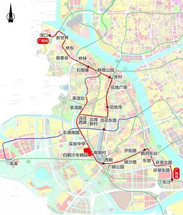 其中率先开建的是 “鹤洞东—花地湾站”,而年底即将通车的也正是该段线路。该段线路全长长7.6公里,线路设12座车站,与地铁接驳站3座,为鹤洞东站(与11号线接驳)、西朗站(与1号线、10号线、22号线、广佛线接驳)、花地湾站(与1号线接驳)。车辆段设于广钢公园以及省实验中学西侧的白鹤沙地块。