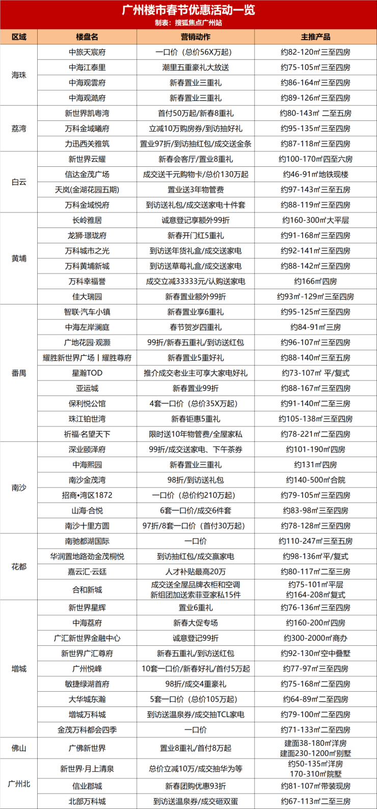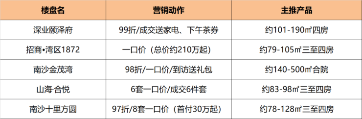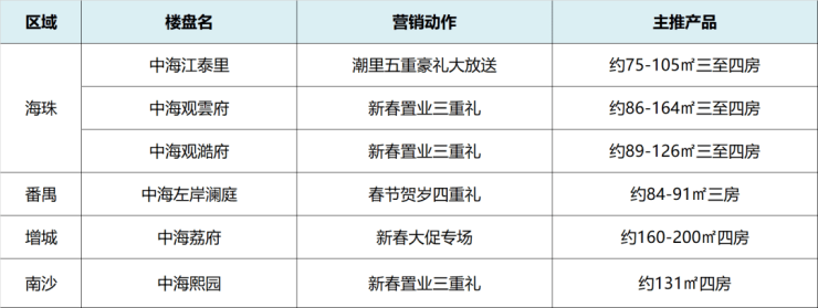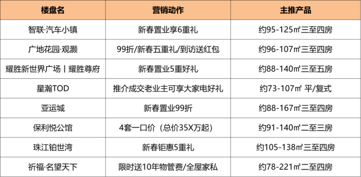 此外,荔湾力迅西关雅筑新春置业可享97折、到访抽红包、成交送金条;中旅天宸府推出多套一口价单位,总价56X万起......
