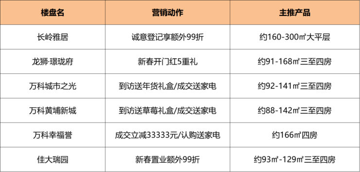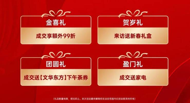 当然,除了房企统一优惠折扣之外,不少项目也会根据自身营销情况,推出各类型的新春活动。而其中,多个楼盘均打出新春多重礼噱头,包括有一口价单位、折扣优惠、到访有礼、成交大礼包、推荐有奖等等。