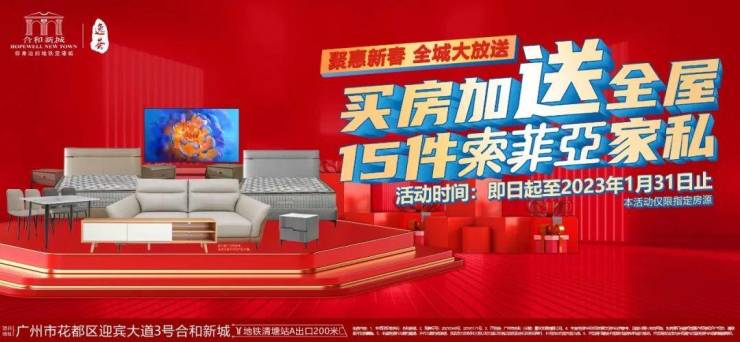 花都唯一双地铁上盖项目——合和新城,全现楼发售,目前主推建面约75-101㎡洋房和164-208㎡复式,总价156万起,春节期间超级送全屋品牌衣柜和全屋格力空调;另外,若是成交新组团,则加送全屋索菲亚家私15件,优惠力度非常大!