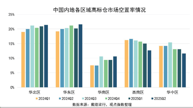在2025年一季度至三季度,长三角凭借完善的制造业与电商生态,成为高标仓供应的核心承载区,高标仓新增供应占比从28%增长至35%。不过,部分区域新增的高标仓供应难以被完全消化,导致各城市群空置率呈现分化态势:长三角、珠三角一线城市因需求支撑充足,空置率维持在15%以下;而城市群外围区域及部分二线城市需求相对不足,空置率攀升至20% 以上。