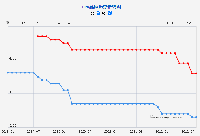 中国人民银行授权全国银行间同业拆借中心公布,2022年9月20日贷款市场报价利率(LPR)为:1年期LPR为3.65%,5年期以上LPR为4.3%,均与上月保持不变。