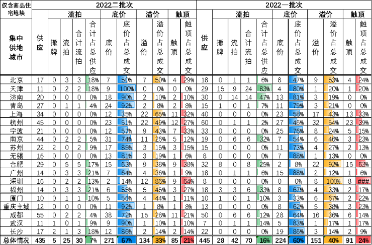 据中指研究院数据显示,第二轮集中供地中,底价成交的宗数在整体成交中占比为67%,溢价成交占比为33%,而一批次这两者的数据对应为60%和40%。
