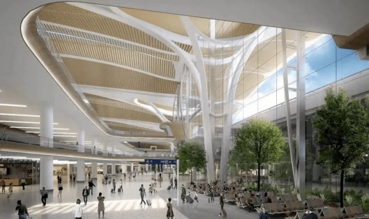 与航站楼一体化设计的综合交通中心,将值机换乘大厅、轨道交通站厅、商业设施、停车楼结合起来,把出港到港流程分层分流,旅客在综合交通中心导向清晰,转乘便捷。