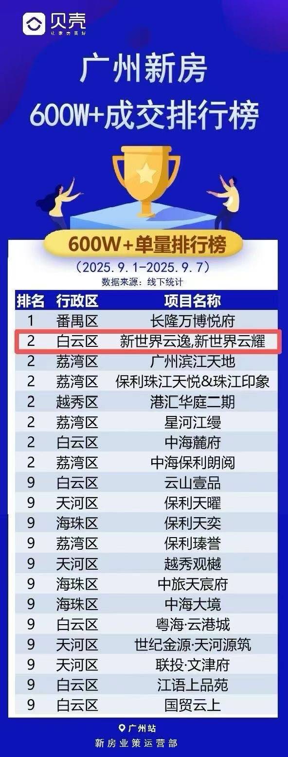 这样的场景,自进入金秋九月以来已成常态。据项目最新数据显示,自9月1日起,新世界云耀单日到访量最高突破100组,首周成交量更突破双位数,高峰时段每小时新增50组预约到访,“线下看房1小时、线上转账5分钟”“深夜2小时完成签约”的案例更是频频出现。另外,根据贝壳线下统计显示,9月1日至7日,广州新房市场中,总价600万+以上楼盘的成交单量排行,新世界云耀稳居白云区TOP1、全市TOP2!