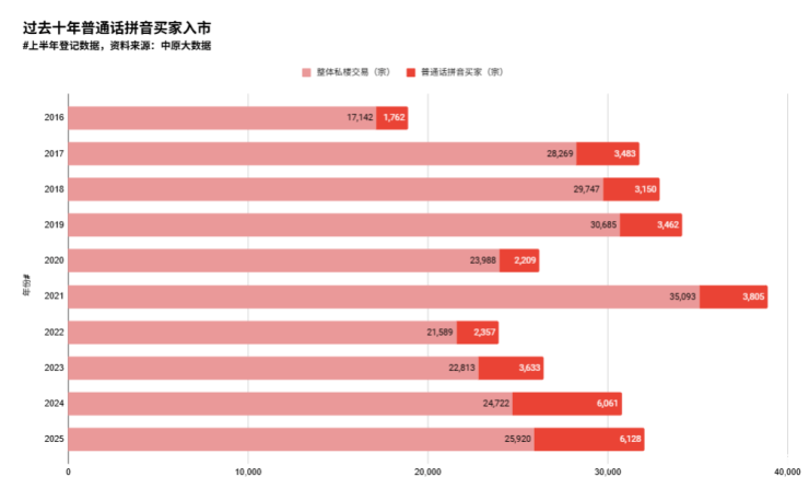从香港中原地产监测的2016年至2025年的成交数据可见,在2016年上半年,香港整体私楼成交17142宗,当中普通话拼音买家1762宗,这意味着十年前内地买家占比为10.3%,香港每卖10套房,仅有一套为内地客购买。近十年间,内地客赴港买房新低发生在2020年上半年,当年上半年香港成交23988套房,但普通话拼音买家只占2209套,占比低至9.2%。